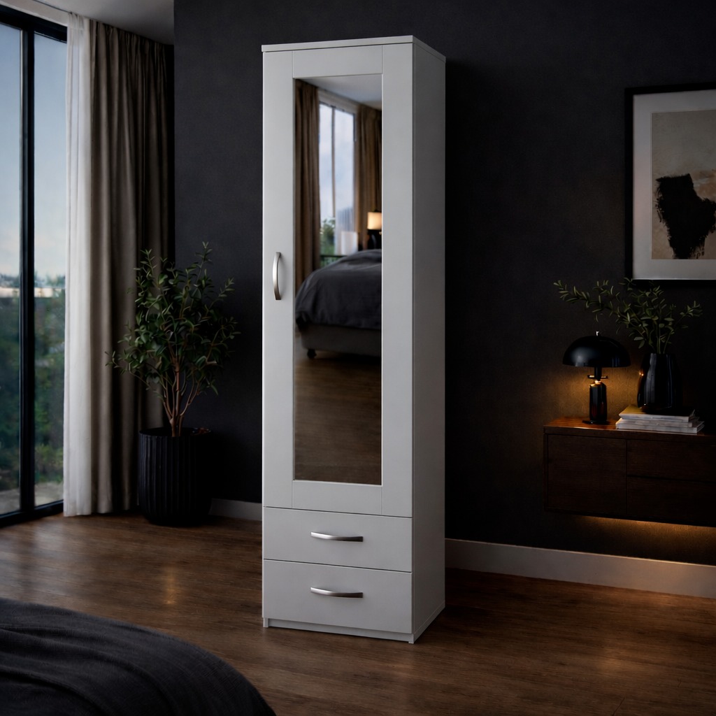 The 1 Door Mirrored Wardrobe with 2 Drawers is a smart and stylish storage solution designed for smaller bedrooms, guest rooms, and modern living spaces. Combining a full-length mirror with practical drawer and hanging storage, this compact wardrobe helps keep your space organised without compromising on style.